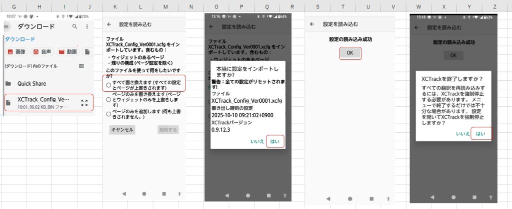 - W)設定を有効化するためにXCTrackの再起動が必要です。はいを押下して強制停止後と起動を行ってください。