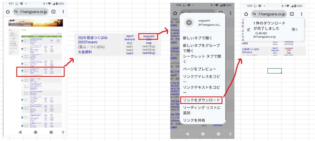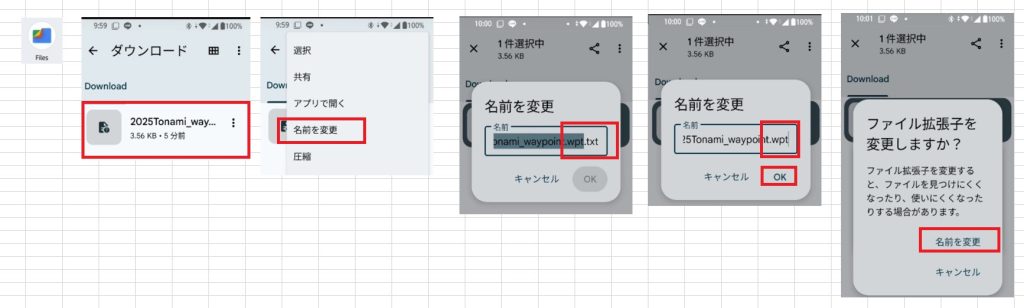- Android携帯でダウンロードを行うと、ファイル名の後ろに.TXTの拡張子が追加される場合があり、XCTrackで読み込めない場合があります。ダウンロードしたファイルの拡張子を.wptに修正します。