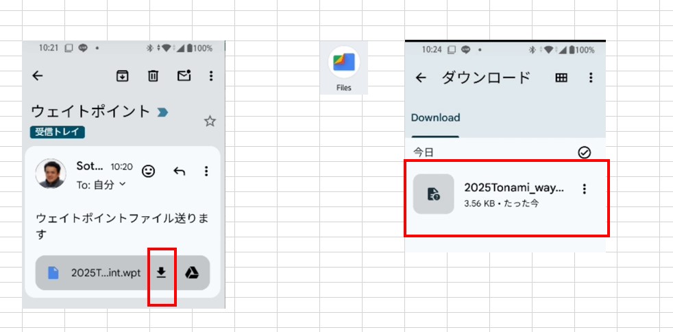 - 前記の通り、外部から受取ったウエイトポイントファイルは携帯の「ダウンロードフォルダ」に保存されています。