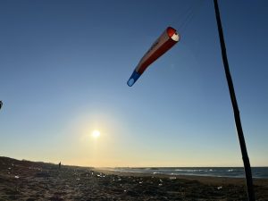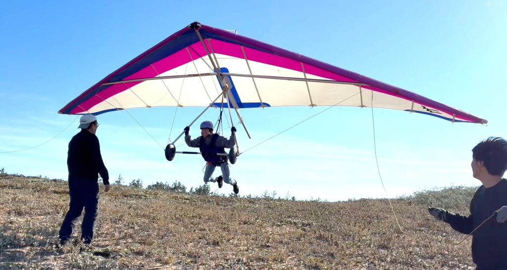 北東の風5mくもり。海岸練習を実施しました。離陸の恐怖心克服シリーズPart3。誰でも宙に浮いた瞬間に感じるこわさを克服するために前回はグライダーに安全ロープ三本取付て強風の中でグライダーに釣り上げられる体験を繰り返しました。今日はPart3、ノーズの安全ロープを取り外して二本取付に変更してピッチコントロールは練習生に自由に操作させます。サイドスリップ事故を防止するため左右の安全ロープは外さずに長めに取りました。そして比較的強い風の中、ハーネスにしっかりと体重を溜込んだ後にジャ~ンプ、をやってもらうと何と言う事でしょう、楽しそうに離陸できるようになったではありませんか! (ビフォーアフター風)