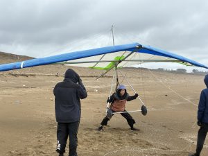 北北西の風6mくもり、海岸練習を行いました。獅子吼周辺は雨でしたが海岸付近はくもり、時々日が差す典型的な北陸の冬の気候。スクール生徒さん全員、強風の中でハンググライダーの浮遊感を楽しんで頂けました。ベースバーを持って軽くプッシュするだけで離陸できるって楽しいですね。強風の海岸って最高!!