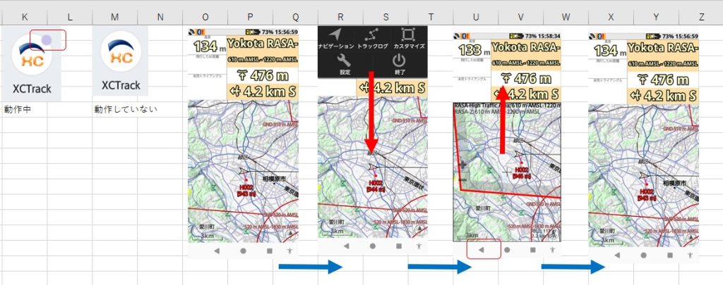 - K)携帯ホーム画面のXCTrackにチェックマークが出ている時はバックグランド動作中です。メニューで終了させるまでは動作を継続します。